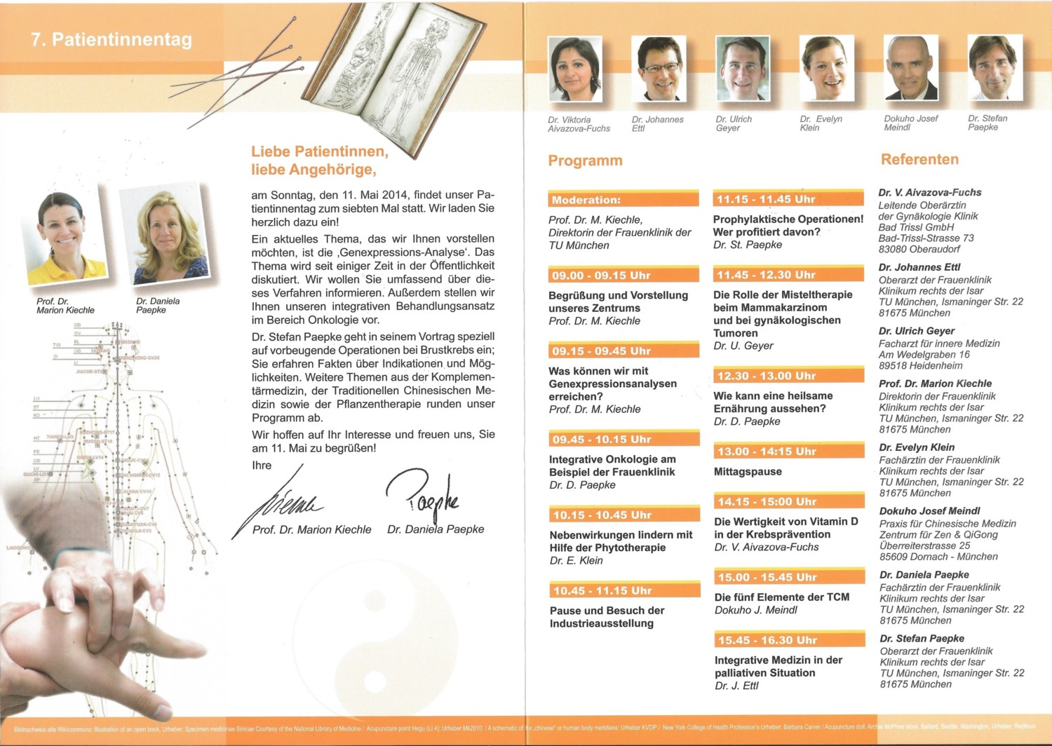 Im Rahmen des 7. Patientinnentages für Komplementärmedizin des Klinikum Rechts der Isar der TU München hielt Dokuho J. Meindl am 11. Mai 2014 einen Vortrag über die 5 Elemente der Traditionellen Chinesischen Medizin. Bei diesem Vortrag, an dem auch die Direktorin und ärztliche Leiterin der Frauenklinik, Frau Prof. Marion Kiechle und Frau Dr. Daniela Paepke anwesend waren, sprach Dokuho J. Meindl über die Grundlagen der 5 Elemente Lehre der TCM und ihren Bezug zu den Emotionen.